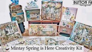 Open the windows and bring the sweet breezes of Springtime into your crafting studio with the Mintay Spring is Here Creative Kit from The Button Farm Club.  Created by Kathy Clement, exclusively for The Button Farm Club, this kit is a lovely mix of home decor projects, a fun flip folio, cards, an explosion box and bonus projects.
