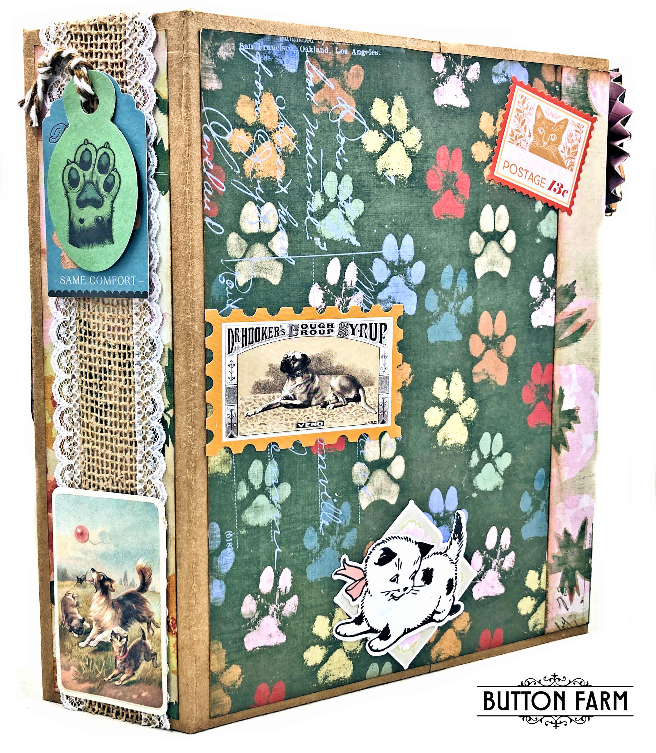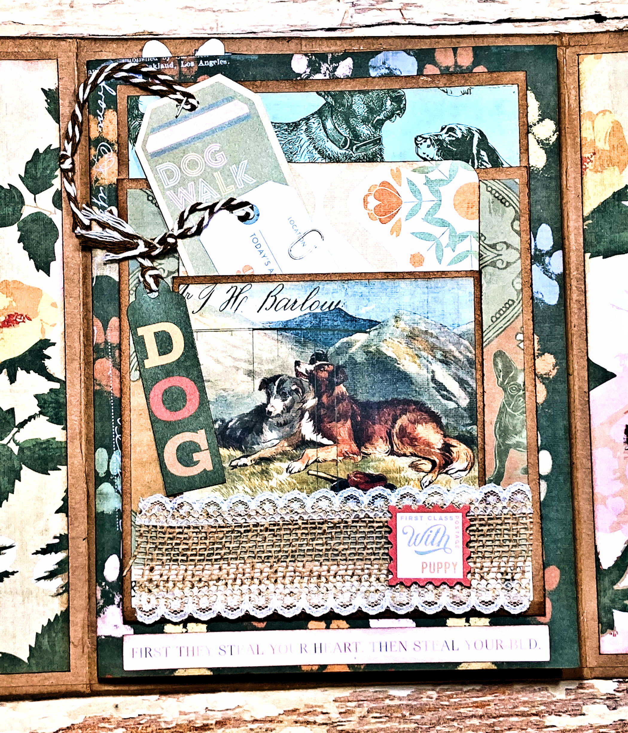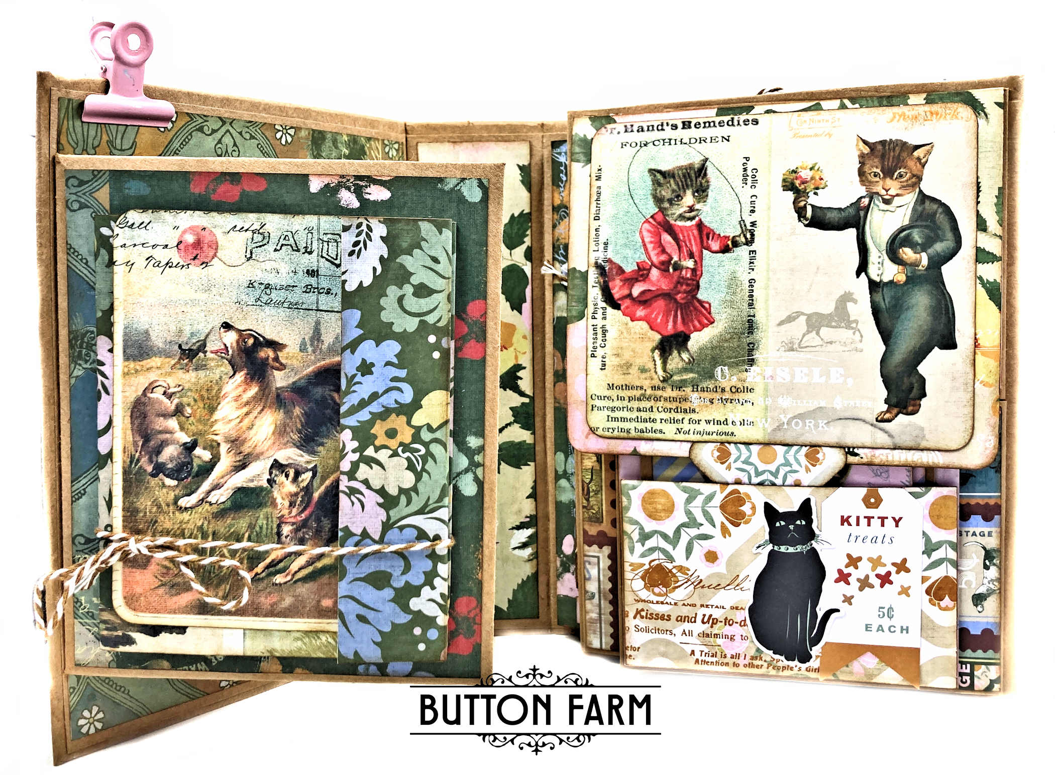 Pretty kitties and handsome doggies abound in this 6” x 8” x 2” folio created with Fancy Pants Spot and Oliver paper collection. The folio design has a charming junk journal vintage vibe and is filled with interactive elements that you’ll want to use again and again.